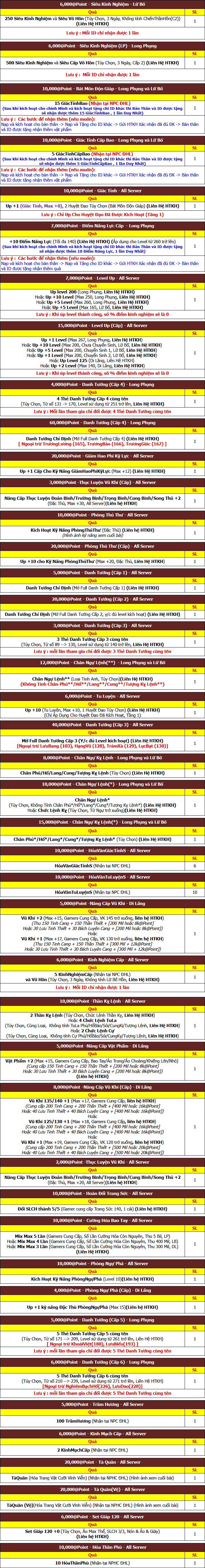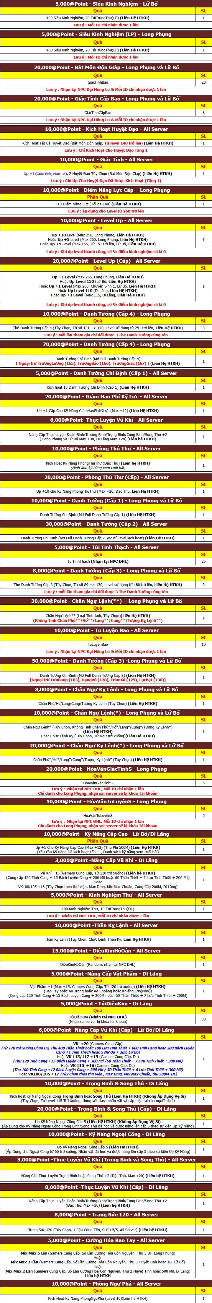Lưu ý : Đối với các mốc quà úp level. Khi úp level thành công, số % điểm kinh nghiệm sẽ về 0.