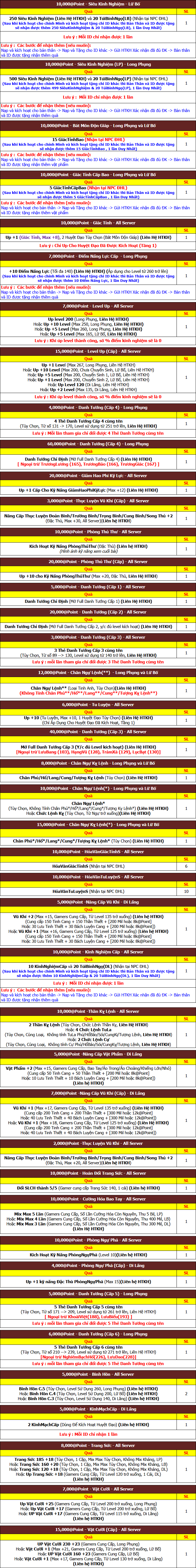 Lưu ý : Đối với các mốc quà úp level. Khi úp level thành công, số % điểm kinh nghiệm sẽ về 0.