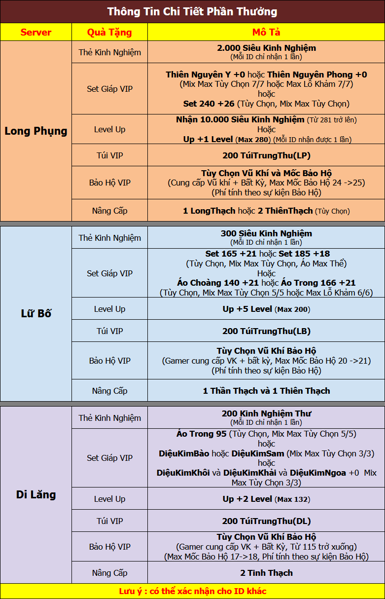 3. Đối với những vật phẩm cần xác nhận thông tin (như +1 cho vũ khí v.v..) thì quý vị anh hùng vui lòng liên hệ bộ phận Hỗ Trợ Khách Hàng để xác nhận thông tin nhận quà.