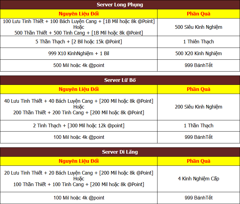 - Cách 1:10 BánhTết + 2 Lưu Tinh Thiết + 2 Bách Luyện Cang + 5.000.000 Gold