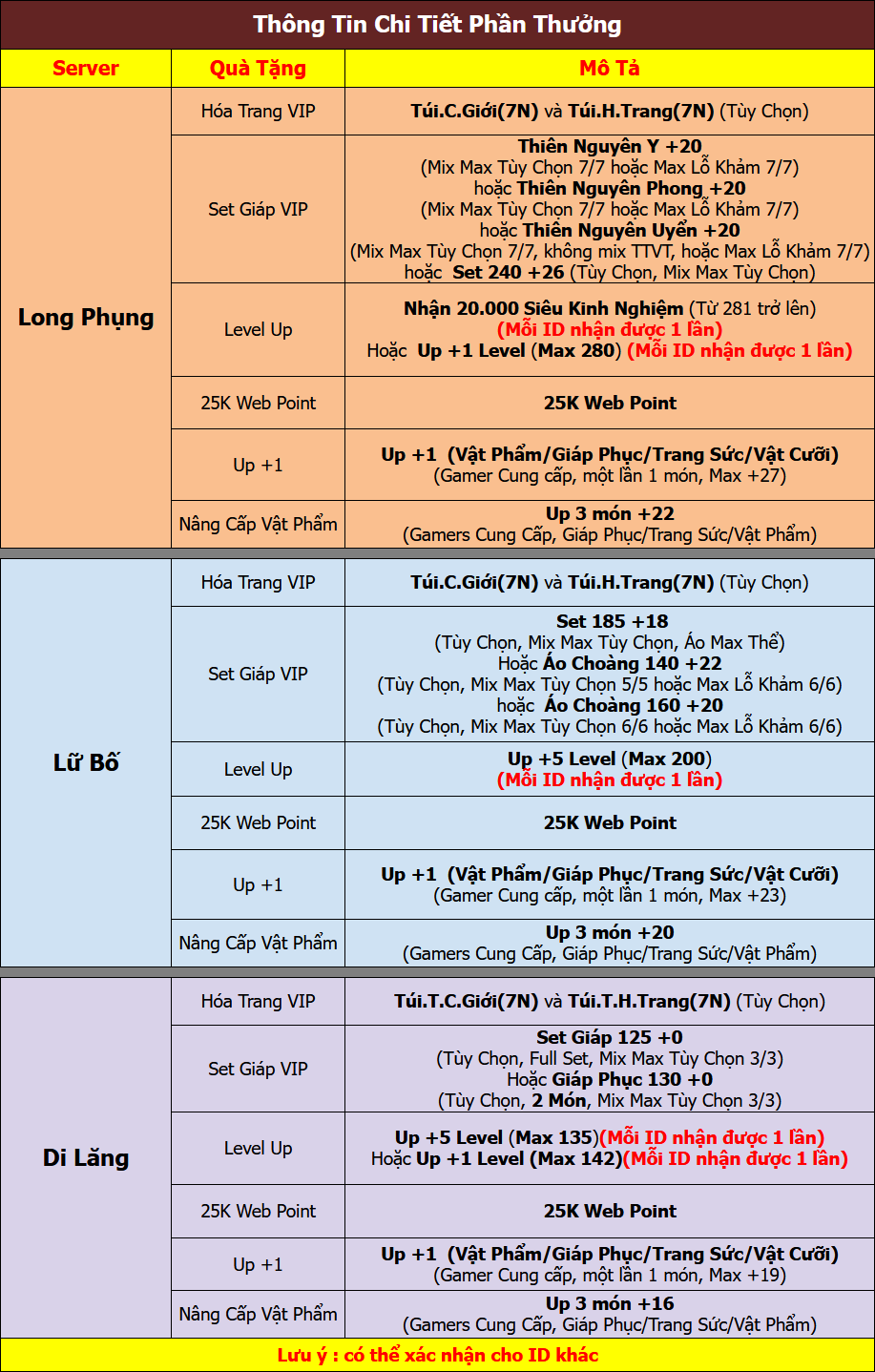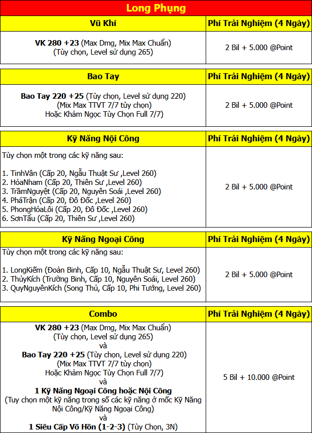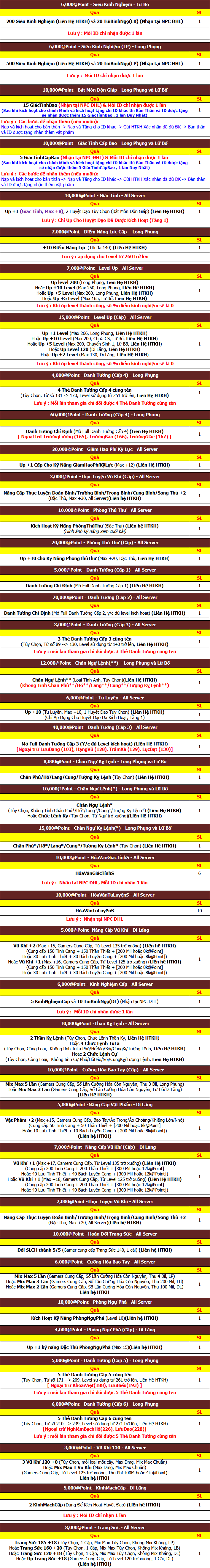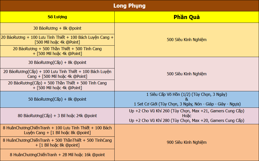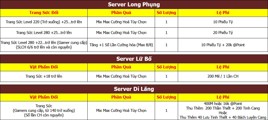 Sự kiện áp dụng cho Server Long Phụng