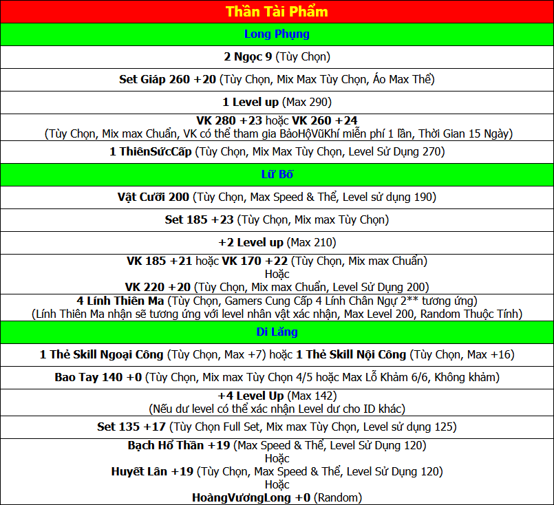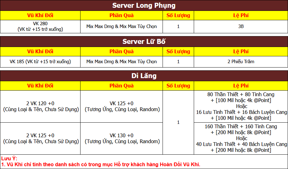 Lưu Ý: Các Vật Phẩm Thiên Quân Tinh, Phiếu Vũ Khí, Phiếu Giáp Phục, Kim Ô Đỉnh, Thần Tài Phẩm phải mở ra từ túi tương ứng với Server của mình mới có thể đổi thưởng:
