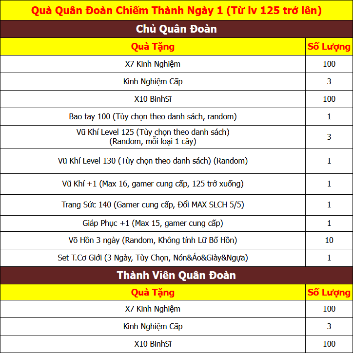 - Hạn chót xác nhận quà của Quân Đoàn chiếm thành là vào 23h59 - ngày Chủ Nhật hằng tuần