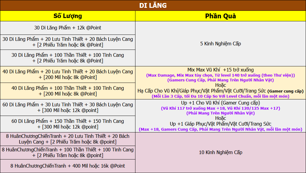 Di Lăng: Đổi Thẻ Vũ Khí +1 hoặc Giáp Phục +1 hoặc Vật Phẩm +1 hoặc Vật Cưỡi +1 hoặc Trang Sức +1