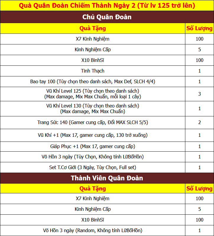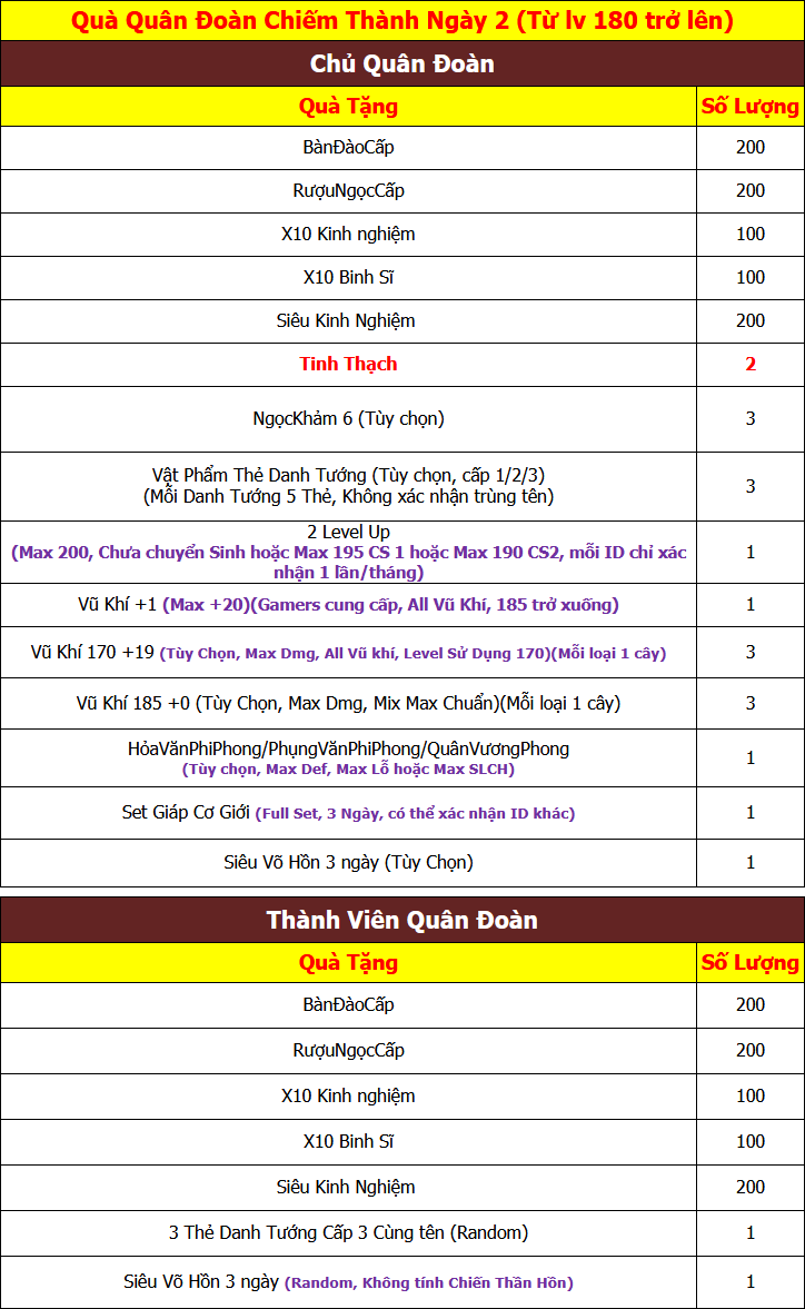 - Hạn chót xác nhận quà của Quân Đoàn chiếm thành là vào 23h59 - ngày thứ Hai hằng tuần