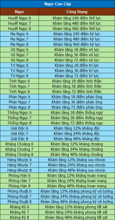 Thư Viện Ngọc Cao Cấp 20.11.2025 Ngọc Siêu CấpNgọc Cao CấpNgọc Sơ Cấp Ngọc Cao Cấp gồm các loại Ngọc Khảm từ cấp 6 đến cấp 8. Lưu Ý: Mỗi vật phẩm chỉ có thể khảm tối đa 6 loại ngọc khác nhau.
