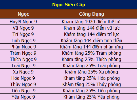 Thư Viện Ngọc Siêu Cấp 21.11.2025 Ngọc Siêu CấpNgọc Cao CấpNgọc Sơ Cấp Ngọc Cao Cấp gồm các loại Ngọc Khảm cấp 9. Lưu Ý: Mỗi vật phẩm chỉ có thể khảm tối đa 6 loại ngọc khác nhau.