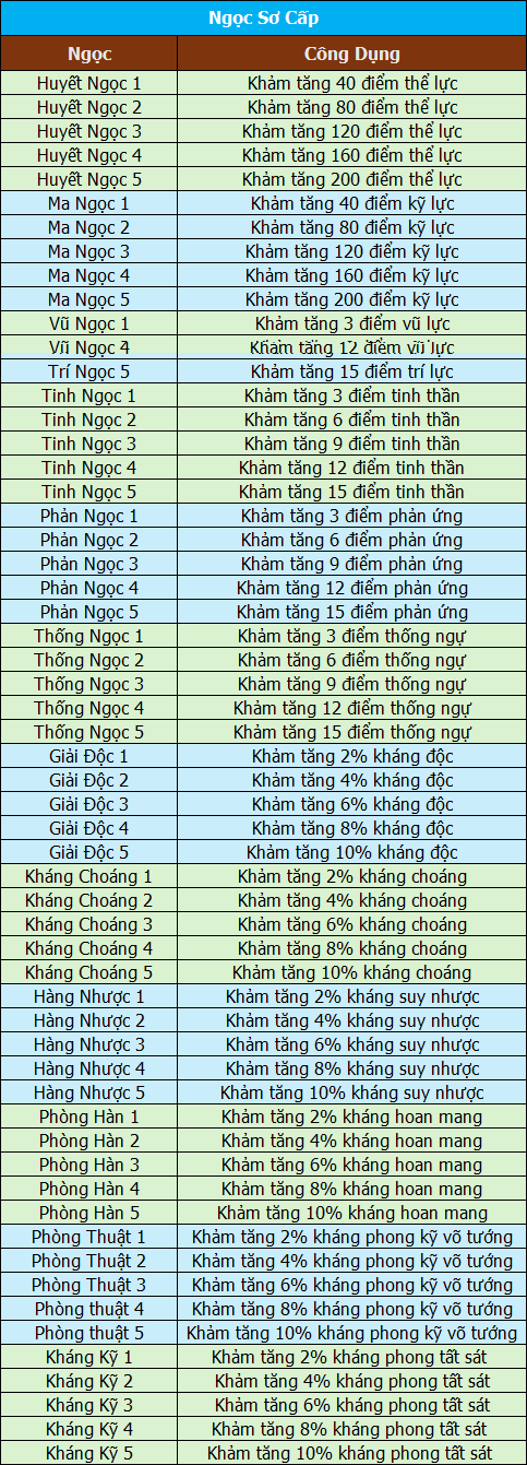 Thư Viện Ngọc Sơ Cấp 20.11.2025 Ngọc Siêu CấpNgọc Cao CấpNgọc Sơ Cấp Ngọc Sơ Cấp gồm các loại Ngọc Khảm từ cấp 1 đến cấp 5. Lưu Ý: Mỗi vật phẩm chỉ có thể khảm tối đa 6 loại ngọc khác nhau.