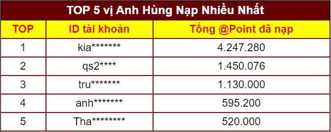 Các vị Anh Hùng có các ID sau vui lòng xác nhận với bộ phận Hỗ Trợ Khách Hàng để TQC Team có thể trao các phần quà đến các vị Anh Hùng một cách nhanh nhất. Xin cảm ơn.